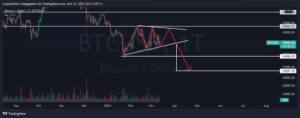 قیمت بیتکوین در چند هفته گذشته مثلثی متقارن ایجاد کرده و این مثلث پس از سقوط قیمت تشکیل شده است بنابراین احتمال شکسته شدن قیمت بیشتر وجود دارد.