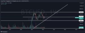نه تنها مرحله جانبی نشانگر این است که قیمت میتواند تا ۶۵ هزار دلار افزایش یابد بلکه خط روند حمایت ۶ ساله نیز به وضوح در شکل ذیل قابل مشاهده است. این خط روند به زودی از حمایت ۳۰ هزار دلاری عبور خواهد کرد به همین دلیل ممکن است دیگر به این زودی شاهد قیمتهای زیر ۳۰ هزار دلار نباشیم.