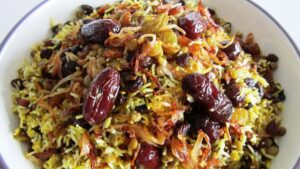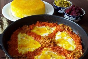 این غذا شامل برنج پختهشده با شیر، ماهی و کوکو سبزی است که این کوکو را با ۷ نوع سبزی تهیه میکنند. بانوان اردبیلی هنگام تهیه غذای شب چهارشنبهسوری، تخممرغهای خام را در پوست خشک پیاز میپیچند و روی پلوی در حال پختن میگذارند. تخم مرغها بخارپز میشوند و پوست پیاز هم باعث رنگین شدن آنها میشود.