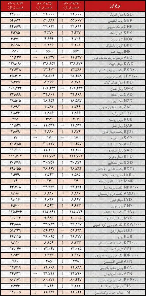 بانک مرکزی امروز، پنجشنبه (۲۶ اسفند)، نرخ رسمی ۴۶ ارز را اعلام کرد که بر اساس آن نرخ ۲۶ ارز افزایش و نرخ ۱۱ ارز کاهش یافت. نرخ باقی ارزها ثابت ماند.