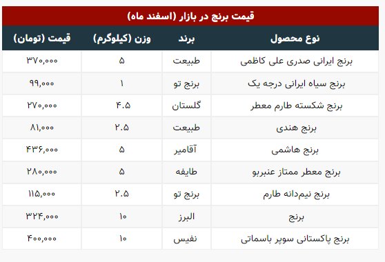 ر جدول زیر قیمت انواع برنج ایرانی و خارجی با برندهای مختلف بررسی شده است. گفتنی است قیمتهای درج شده مربوط به سایتهای فروش اینترنتی است.