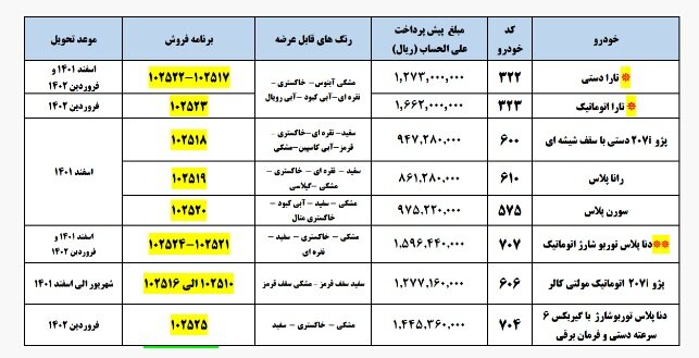 ایران خودرو از امروز سه شنبه مورخ ۲۳ فروردین ۱۴۰۱ اولین مرحله پیش فروش ویژه مادران واجد شرایط آغاز می کند. این طرح تا پایان روز پنجشنبه مورخ ۲۵ فروردین ادامه خواهد داشت. تارا دستی، تارا اتوماتیک، پژو ۲۰۷ دستی سقف شیشهای، رانا پلاس، سورن پلاس، دنا پلاس اتوماتیک توربو شارژ، پژو ۲۰۷ اتوماتیک مولتی کالر و دنا پلاس توربو شارژ با گیربکس شش سرعه دستی محصولات عرضه شده در این مرحله خواهند بود.